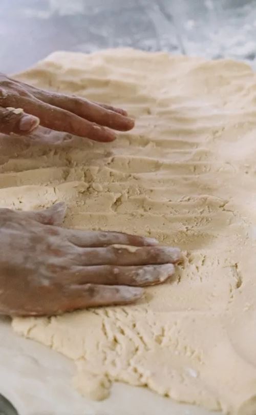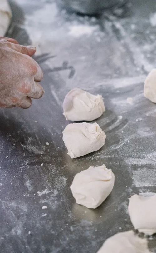 猪板油在锅里熬得透亮,滤净渣滓,凝成雪白玉脂,这是酥皮灵魂所在;香葱要选本地小葱,切碎备用。案板上,水油皮裹住油酥,被师傅巧手擀开、卷起,再分成一个个小剂子。甜口做成椭圆状,包入炒香的芝麻白糖馅;咸口做成溜圆型,填入用板油丁拌的葱油馅。