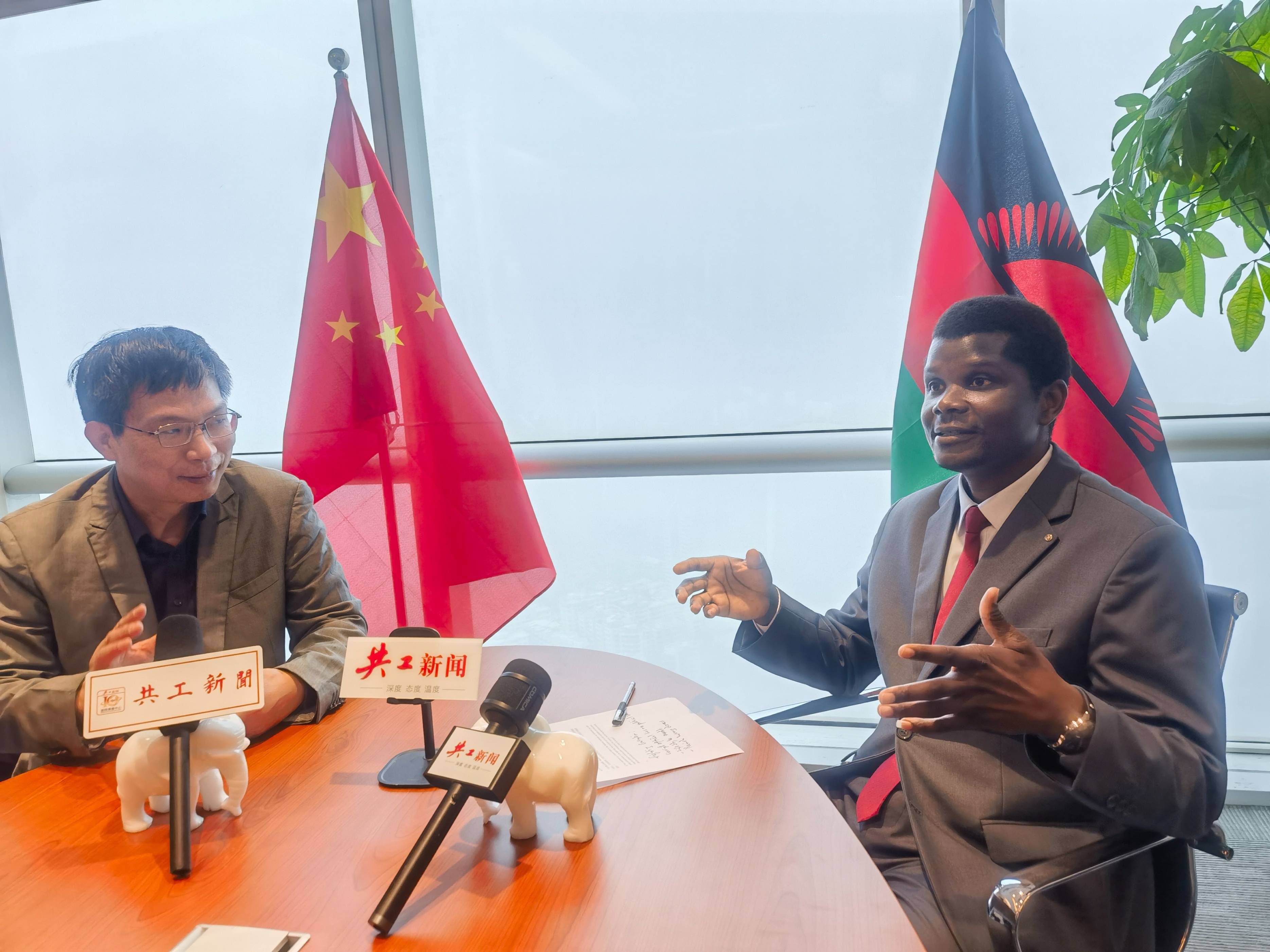 图说:共工新闻社总编办副主任、记者廖红麟(左)于2026年3月21日下午专访马拉维共和国总统候选人简尼·格雷·卡苏达(共工新闻记者 廖静文 摄)